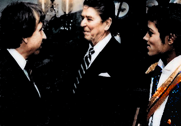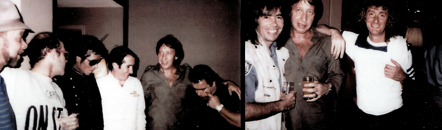 Dallas: Elton and MJ playing separate venues. Norm delivers Michael to a warm suite where the icons and crew reveled 'til dawn. MJ security chief, Bill Bray, the superstars of the '70s and '80s, and managers John Reid and Frank Delio. At right, Drummer Nigel Olsson and Dee flank 'our hero.'